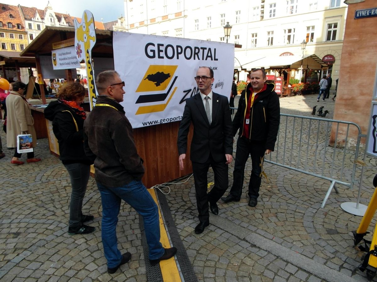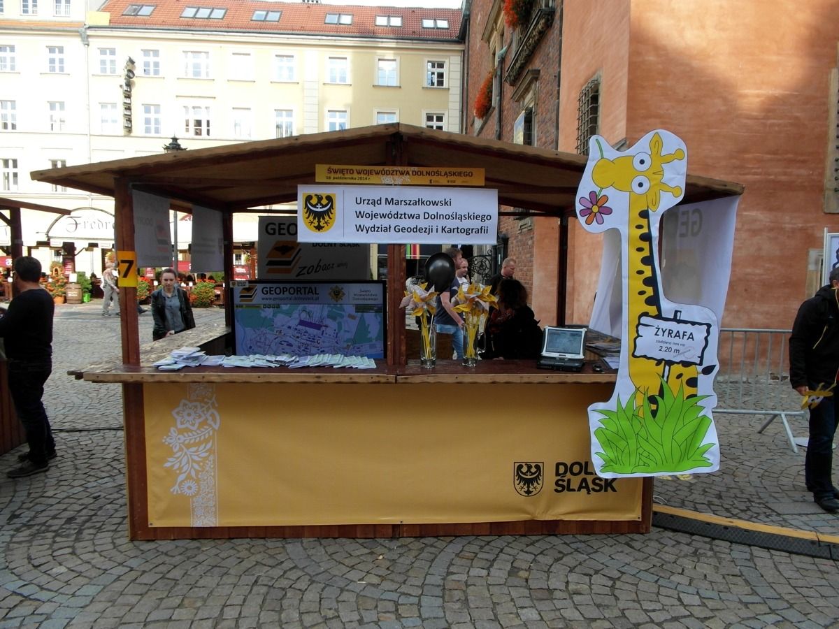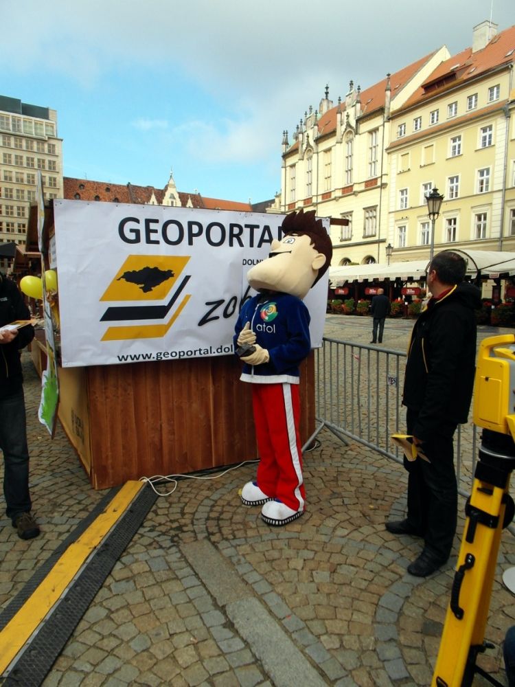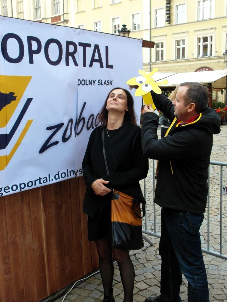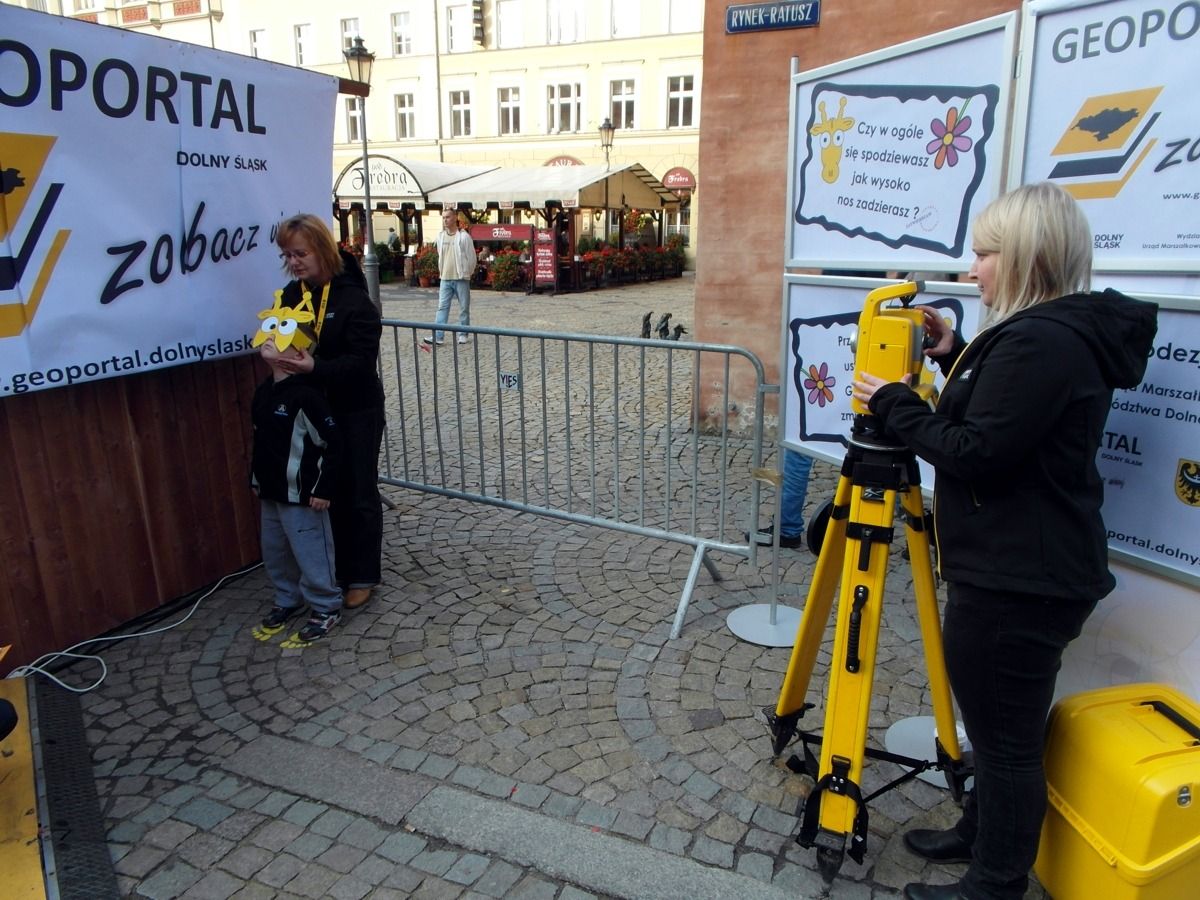 W minioną sobotę 18 października 2014 r. na Rynku Starego Miasta we Wrocławiu odbyły się obchody Święta Województwa Dolnośląskiego. Nie zabrakło tam przedstawicieli Geoportalu Dolnego Śląska. Przy stoisku nr 37 w godz. 10.00 - 18.00 można było zapoznać się z możliwościami naszego geoportalu, porozmawiać o systemach informacji przestrzennej, a nawet dokonać pomiaru dumy Dolnoślązaka metodą wyznaczania wysokości zadzierania nosa. Nasz punkt cieszył sie ogromną popularmnością - odwiedziły go setki mieszkańców chcących porozmawiać o cyfrowych mapach Dolnego Śląska i uzyskac certyfikat pomiaru tachimetrem. Dziękujemy wszystkim za przybycie!