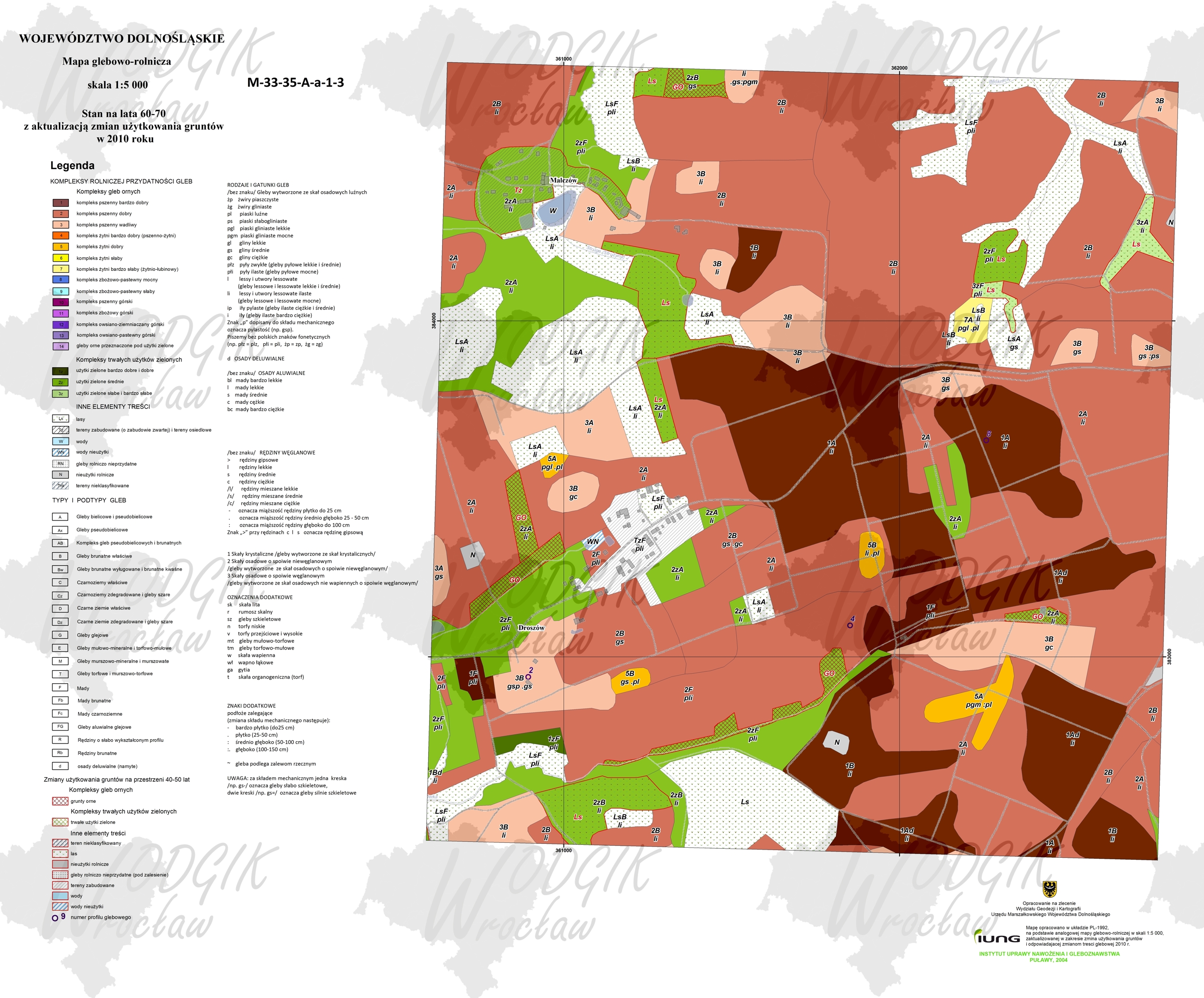 - wydzielenia konturów glebowych wraz z atrybutami określającymi rodzaj kompleksu przydatności rolniczej gleby, typ i podtyp genetyczny gleby oraz skład mechaniczny warstw w profilu glebowym stan na lata 1960-70 (okres, w którym tworzone były analogowe mapy glebowo-rolnicze w skali 1:5 000),