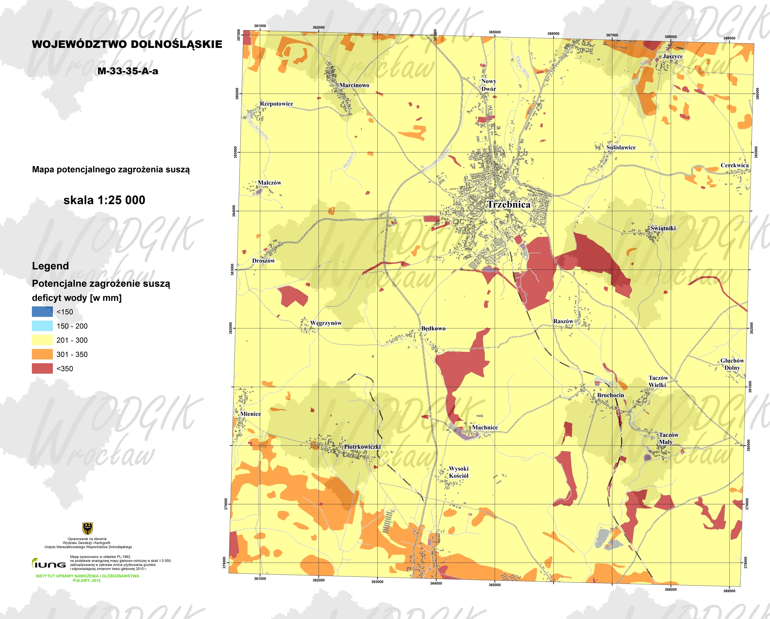 Mapa potencjalnego zagrożenia suszą rolniczą powstała w oparciu o model bilansu wodnego gleb, informacje o glebach z mapy glebowo-rolniczej w skali 1: 5 000 oraz wyinterpolowaną wysokość opadów.